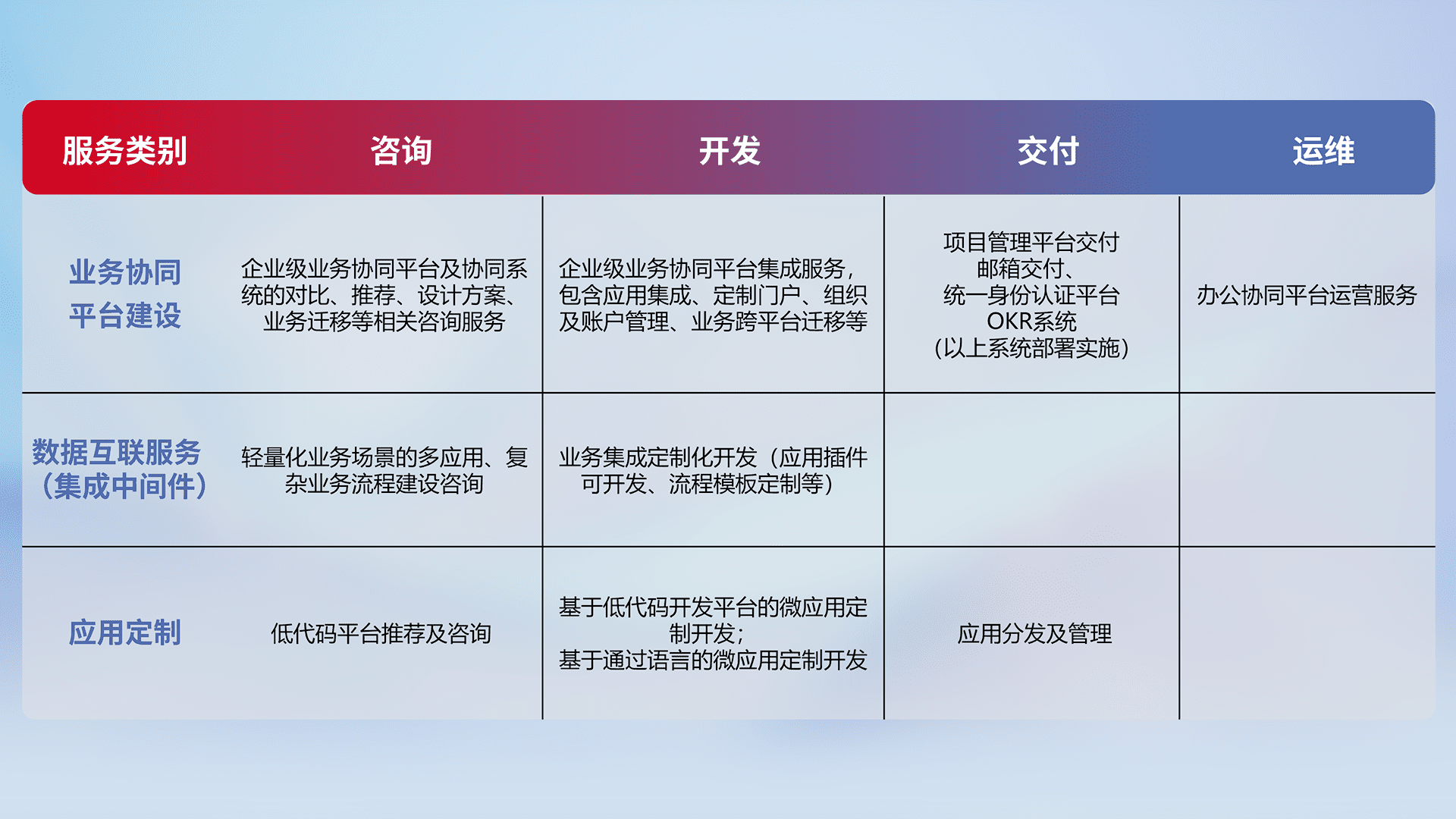 针对钉钉、、企微、、、IDaas等平台级产品提供产品的规划、、、方案、、交付、、、定制化开发等服务,,,实现如统一协同办公、、、、智能客户服务、、、、混合会议管理、、、智能数据查询、、等业务场景,,,实现数字化转型。。。。