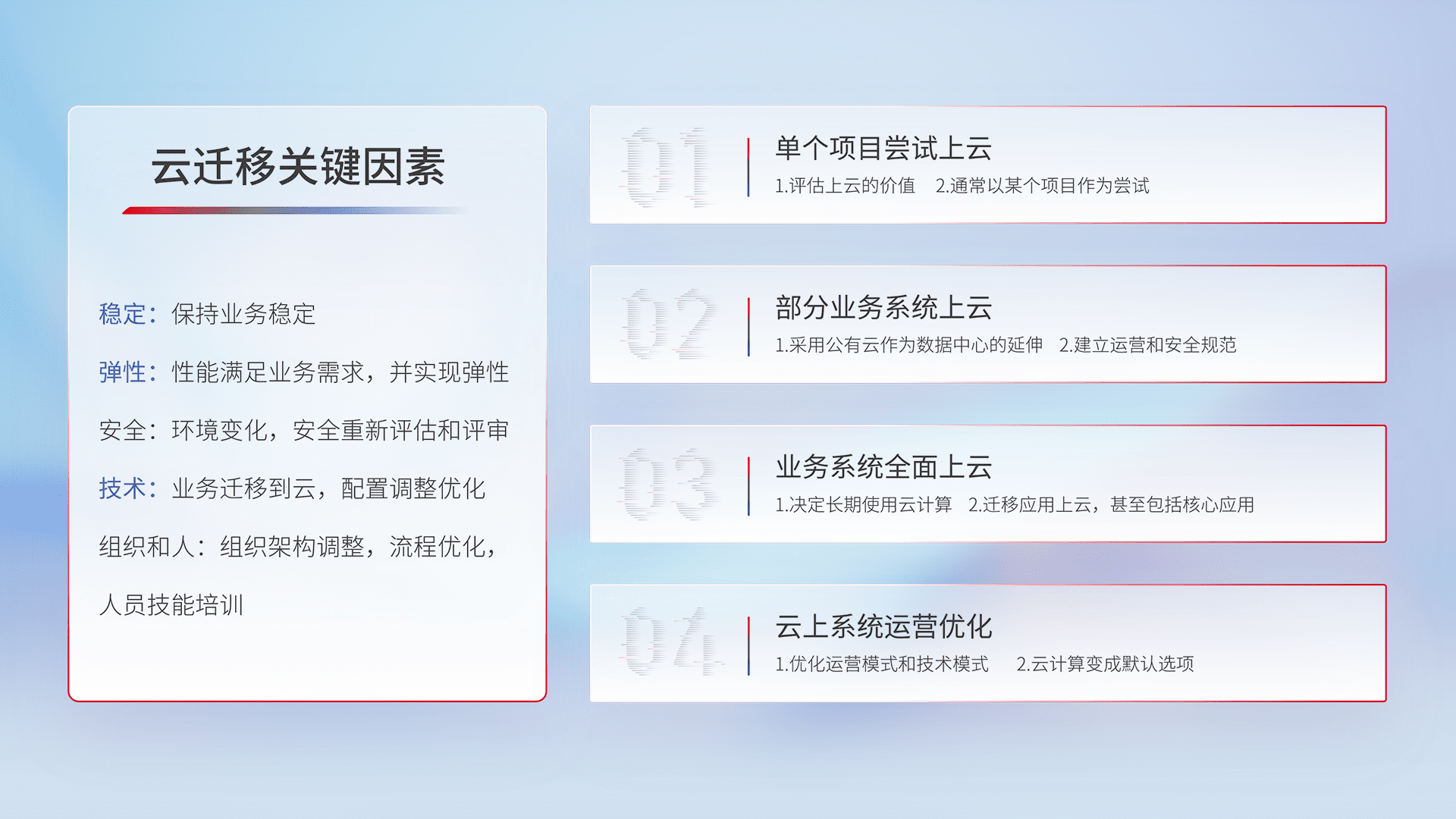 结合实际业务,,,从规划设计、、、云平台选型、、云原生改造、、数据迁移、、集成交付,,迁移全过程为客户识别最佳上云路径,,做好风险识别管理,,设计网络架构、、、身份权限、、、、安全审计合规、、操作审计、、、、日志审计、、、监控告警策略、、、、多站点容灾设计等,,对云上基础设施进行整体规划,,,提升IT治理水平,,,以满足弹性、、高可用、、高性能的需求。。。