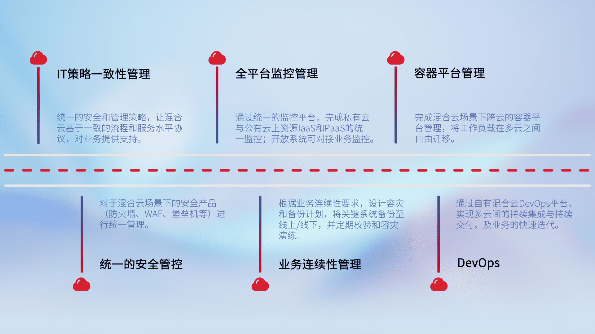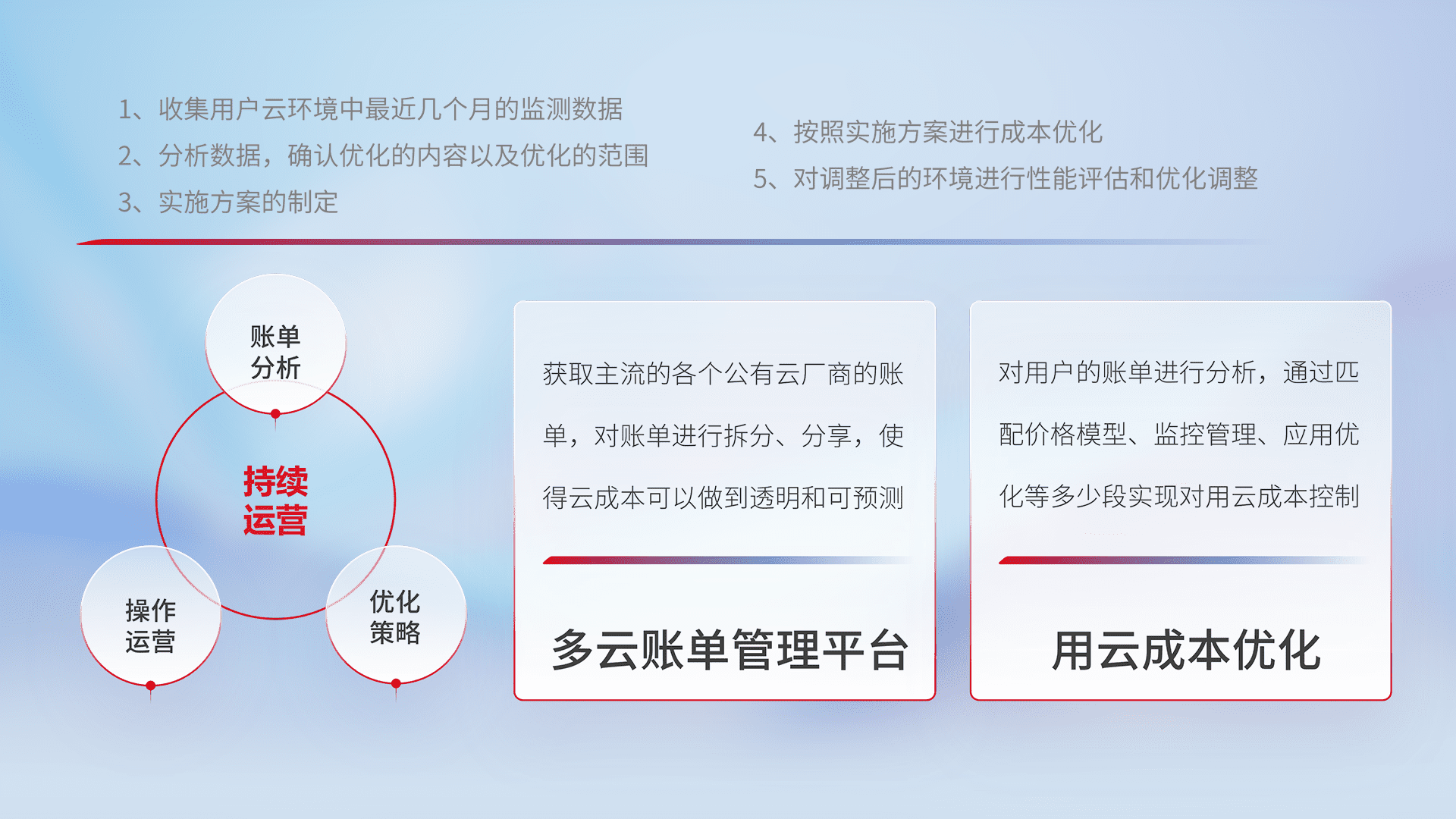 通过多云纳管,,以统一的资源数据模型把客户的云资源进行抽象和封装,,,进而实现对多云资源的统一操作,,,保障云资源管理的可靠性、、稳定性与可用性。。。量身定制化运维内容,,配置、、、、开发运维、、、补丁管理、、、、备份、、监控、、、认证和访问管理、、、、审计和日常巡检等,,,保障在用云过程中的可靠度,,稳定度以及高可用率。。